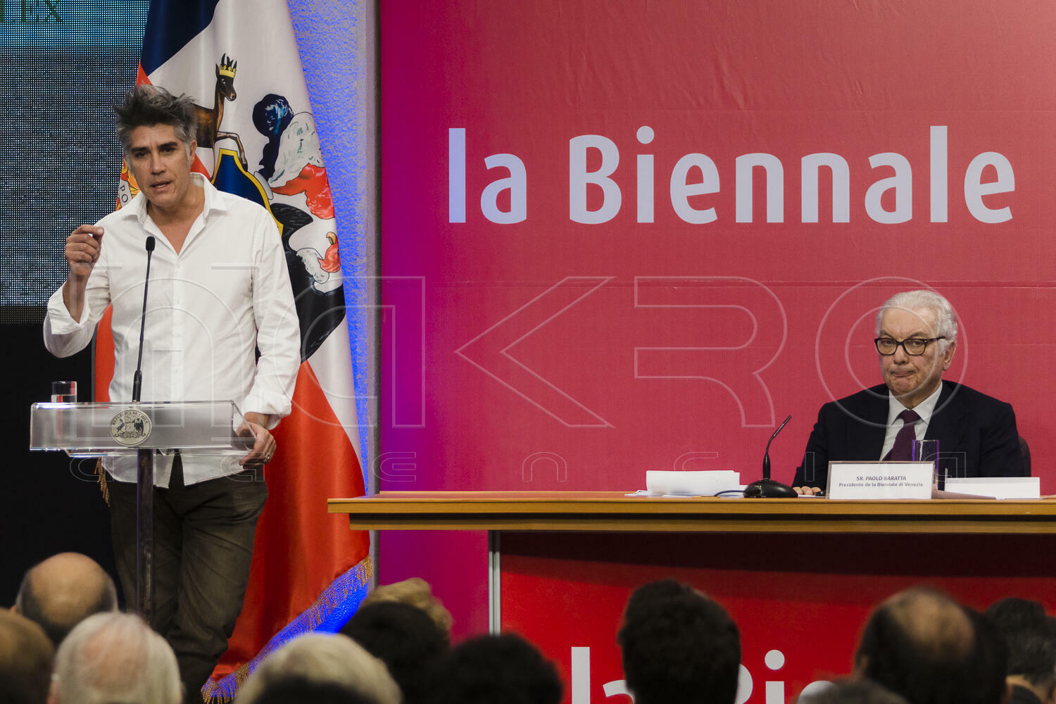El patio de las Camelias del Palacio de La Moneda fue escenario para la primera conferencia de prensa que la Bienal de Venecia organiza en Chile, que tuvo como protagonistas al curador de la XV Bienal de Arquitectura de Venecia, el chileno Alejandro Aravena, y al presidente de la Bienal Paolo Baratta.